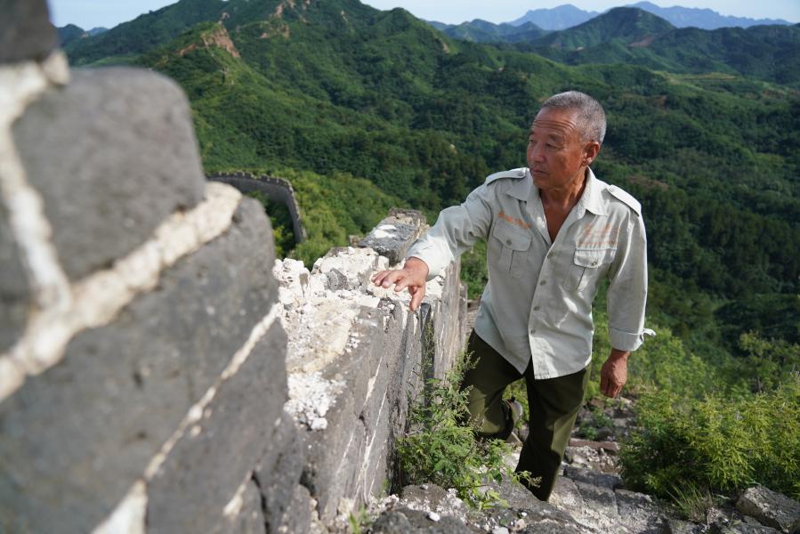 Zhang Heshan patrols the Chengziyu Great Wall in Qinhuangdao, north China's Hebei Province, Aug. 20, 2020. (Xinhua/Mu Yu)