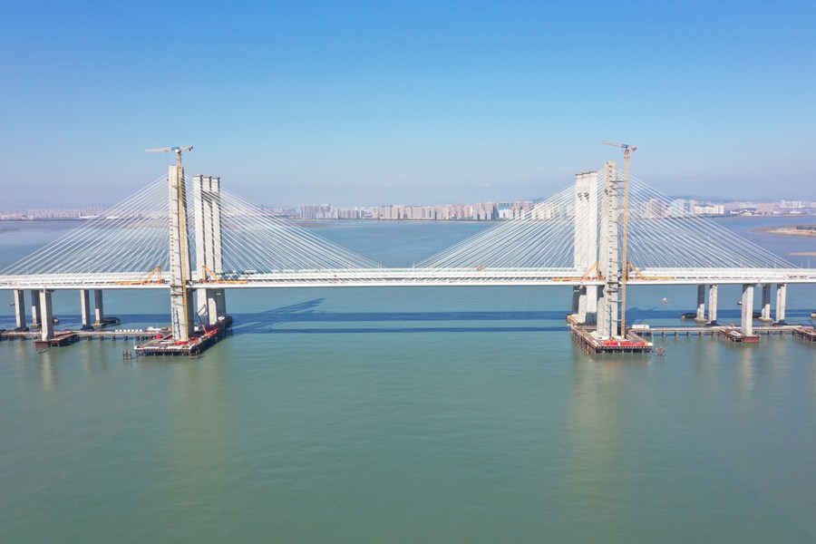 Aerial photo taken on Nov. 30, 2021 shows the main bridge of the Quanzhou Bay cross-sea bridge of the Fuzhou-Xiamen high-speed railway in southeast China's Fujian Province. (Xinhua/Lin Shanchuan)
