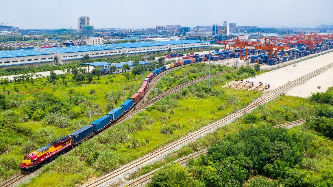 Photo taken on July 12, 2021 shows a China-Europe freight train fully loaded with containers leaving Chengdu International Railway Port in Chengdu, capital of southwest China’s Sichuan province, for Slawkow, Poland. (People’s Daily Online/Bai Guibin)