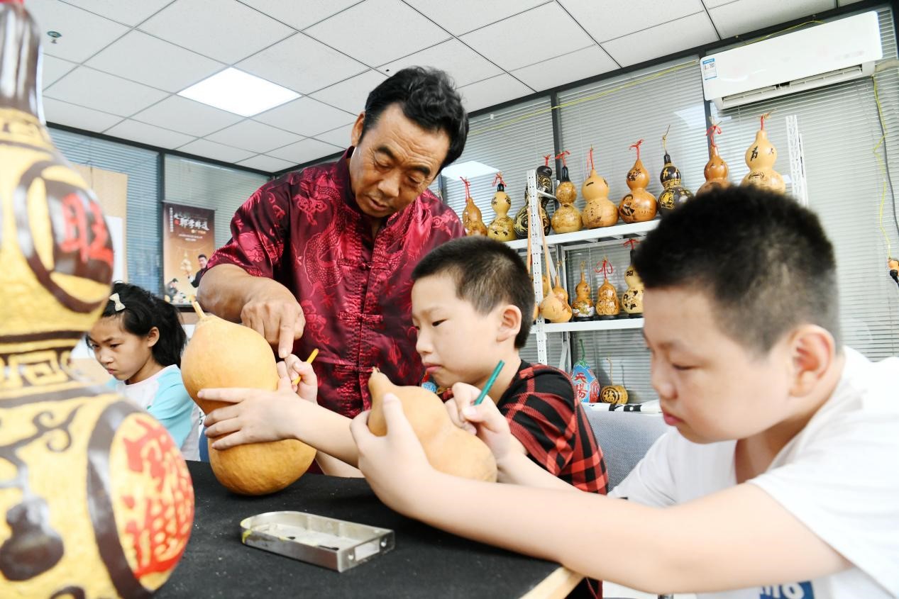 Long Changqing, an inheritor of the intangible cultural heritage of calabash painting, teaches children the technique at Beiwu village, Guangping county, Handan city, north China’s Hebei province, July 14, 2021. (People’s Daily Online/Cheng Xuehu)