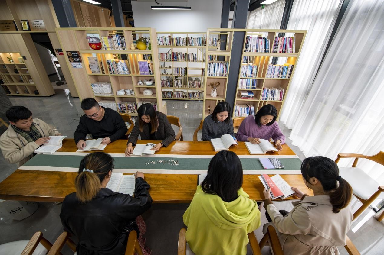 Villagers read at a newly renovated library in Hushang village, Pan’an county, Jinhua city, east China’s Zhejiang province, Nov. 2, 2021. (People’s Daily Online/Hu Xiaofei)