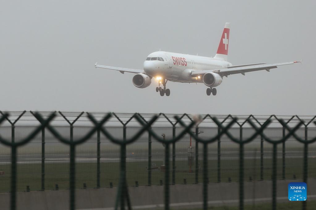 A Swiss aircraft prepares for landing at the Brussels Airport in Zaventem, Belgium, Nov. 30, 2021. Omicron, a new COVID-19 variant, has been detected in a growing number of countries and regions worldwide, prompting governments to tighten their restrictions and impose new travel bans. (Xinhua/Zheng Huansong)