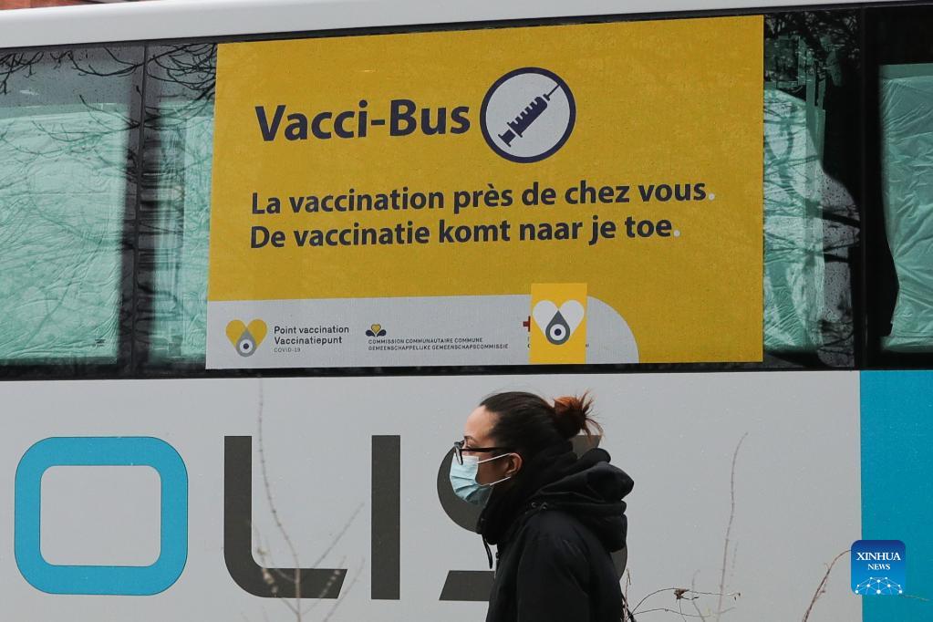 A woman passes a bus for vaccination in Brussels, Belgium, Nov. 30, 2021. Omicron, a new COVID-19 variant, has been detected in a growing number of countries and regions worldwide, prompting governments to tighten their restrictions and impose new travel bans. (Xinhua/Zheng Huansong)