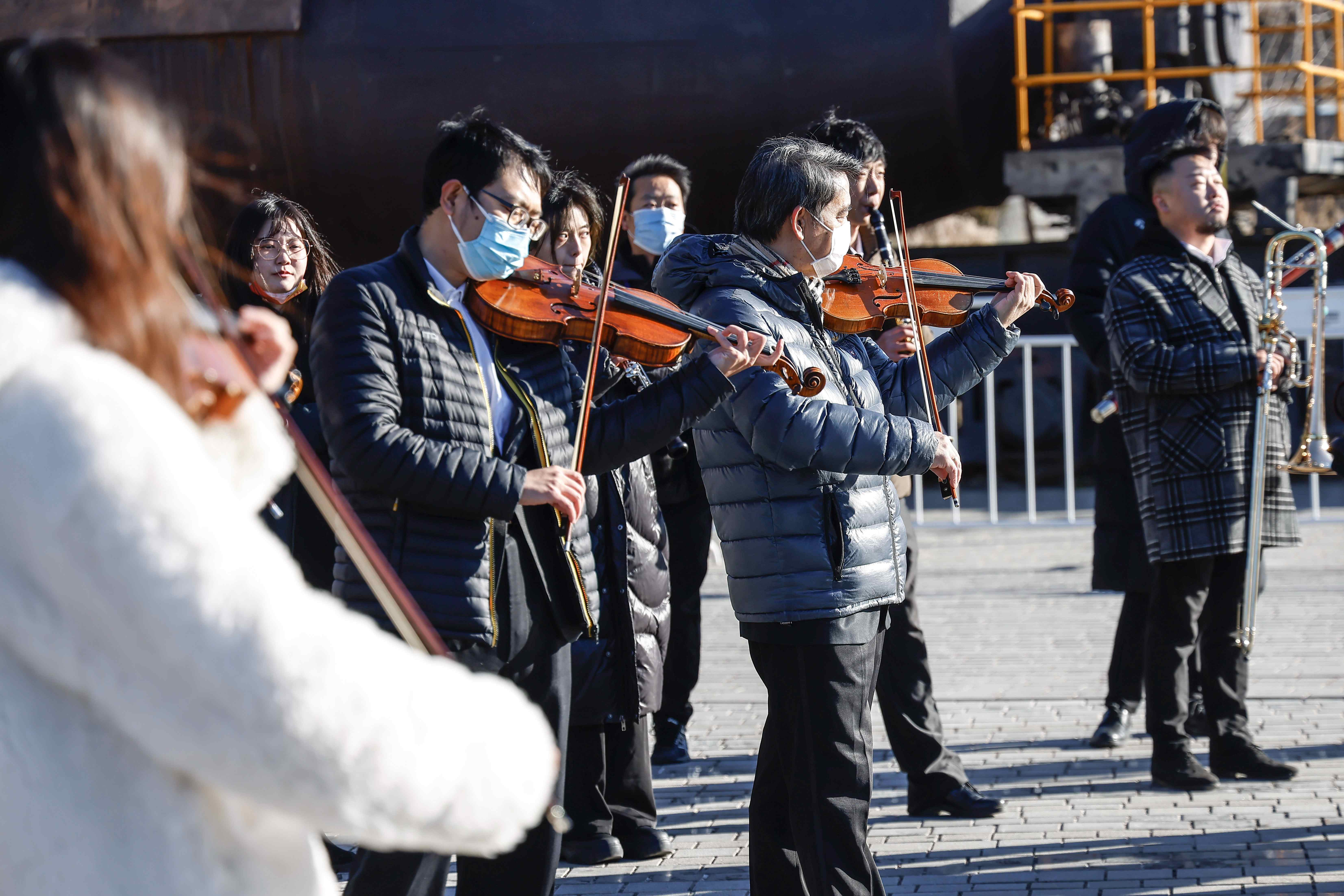Musicians from the International Master Philharmonic Orchestra play Jean Sibelius’s Finlandia at Shougang Park in Beijing, Nov. 30, 2021. (People’s Daily Online/Peng Yukai)