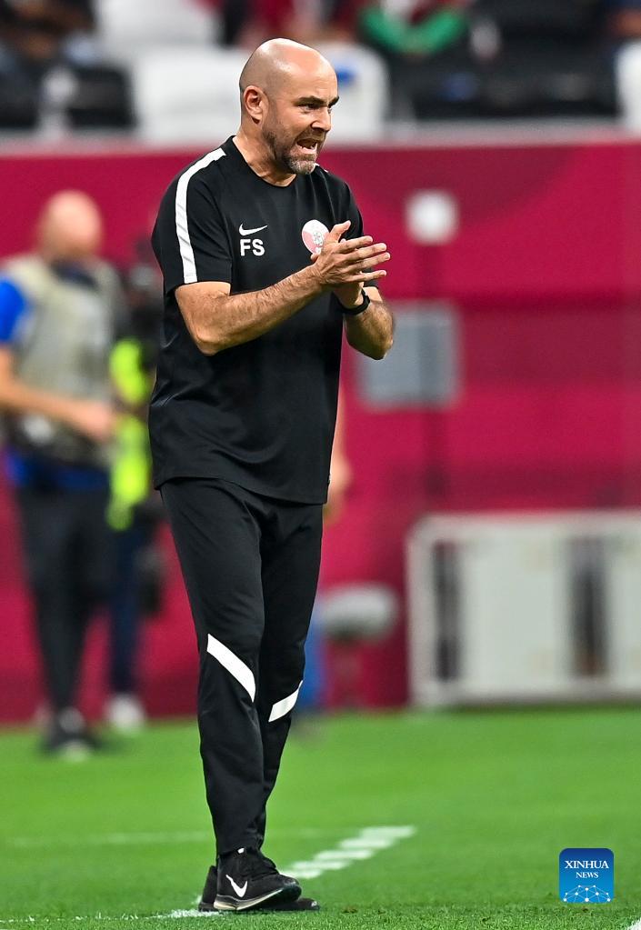 Qatar's head coach Francesc Sancez gestures during the FIFA Arab Cup 2021 Group A match between Qatar and Bahrain in Al Khor, Qatar, Nov. 30, 2021. (Photo by Nikku/Xinhua)