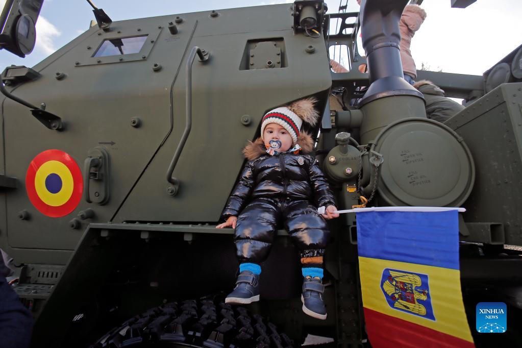 A child poses for a photo after the National Day military parade at the Arch of Triumph in Bucharest, Romania, Dec. 1, 2021. (Photo by Cristian Cristel/Xinhua)