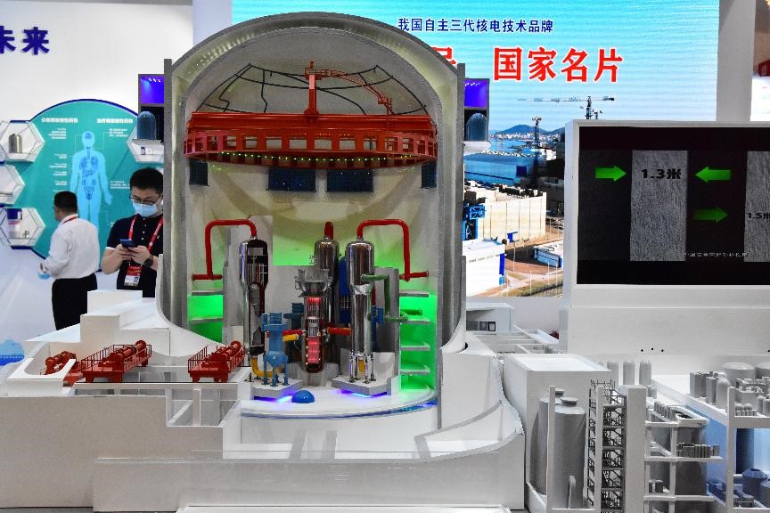 Photo taken on May 10, 2021 shows a model of nuclear reactor Hualong One exhibited by China National Nuclear Corporation at an expo on China indigenous brands held in east China’s Shanghai. (People’s Daily Online/Zhou Dongchao)