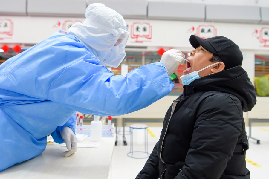 A staff member takes a swab sample from a resident for nucleic acid test at a testing site in Manzhouli, north China's Inner Mongolia Autonomous Region, Nov. 29, 2021. (Xinhua/Li Zhipeng)