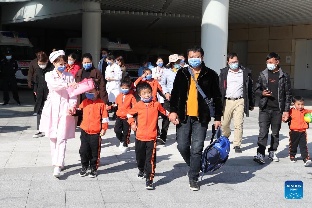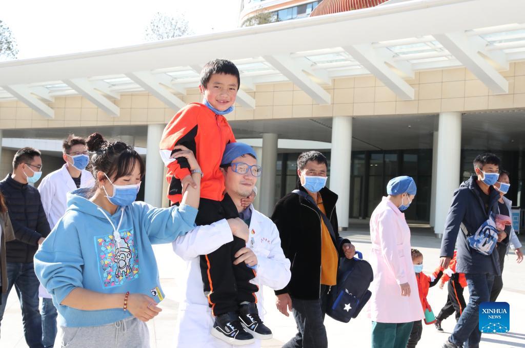 Recovered children with congenital heart disease(CHD) and their families escorted by medical staff walk out of Fujian Children's Hospital in Fuzhou, southeast China's Fujian Province, Dec. 1, 2021. Nine children with CHD from Qamdo of southwest China's Tibet Autonomous Region were discharged from Fujian Children's Hospital after 20 days of free treatment on Wednesday. At the end of October, doctors from Fujian and Shanghai carried out a CHD screening program in Qamdo among more than 1,000 children. Nine children with CHD, accompanied by their families, arrived in Fuzhou on Nov. 12 and received surgery on Nov. 19. (Xinhua/Jiang Kehong)