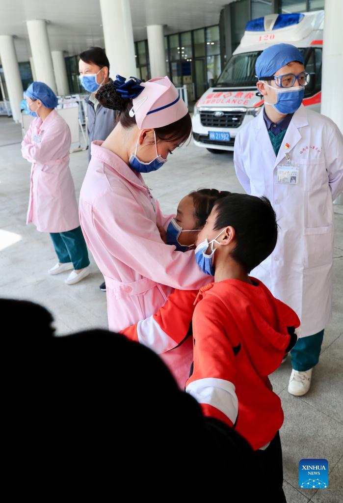 Recovered children with congenital heart disease(CHD) bid farewell to a medical staff member in Fujian Children's Hospital in Fuzhou, southeast China's Fujian Province, Dec. 1, 2021. Nine children with CHD from Qamdo of southwest China's Tibet Autonomous Region were discharged from Fujian Children's Hospital after 20 days of free treatment on Wednesday. At the end of October, doctors from Fujian and Shanghai carried out a CHD screening program in Qamdo among more than 1,000 children. Nine children with CHD, accompanied by their families, arrived in Fuzhou on Nov. 12 and received surgery on Nov. 19. (Xinhua/Jiang Kehong)