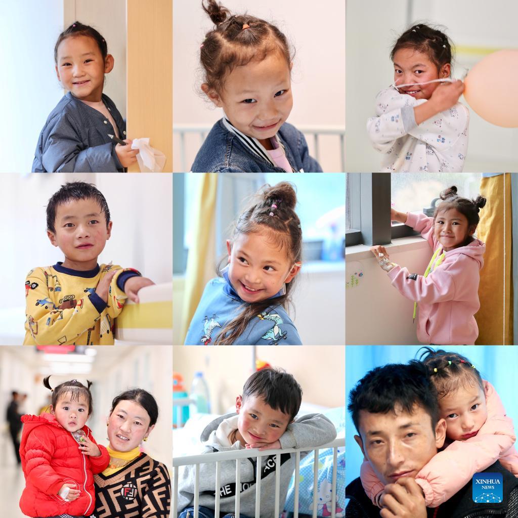 Combo photo taken on Nov. 29, 2021 shows the nine children with congenital heart disease(CHD) receiving treatment in Fujian Children's Hospital in Fuzhou, southeast China's Fujian Province. Nine children with CHD from Qamdo of southwest China's Tibet Autonomous Region were discharged from Fujian Children's Hospital after 20 days of free treatment on Wednesday. At the end of October, doctors from Fujian and Shanghai carried out a CHD screening program in Qamdo among more than 1,000 children. Nine children with CHD, accompanied by their families, arrived in Fuzhou on Nov. 12 and received surgery on Nov. 19. (Xinhua/Jiang Kehong)