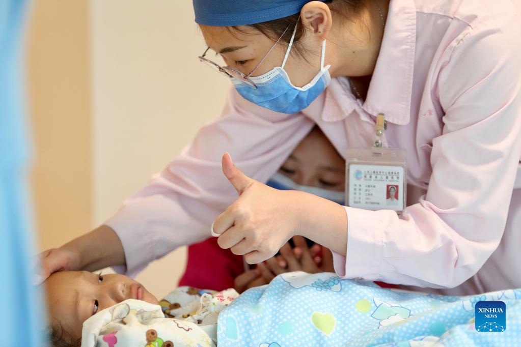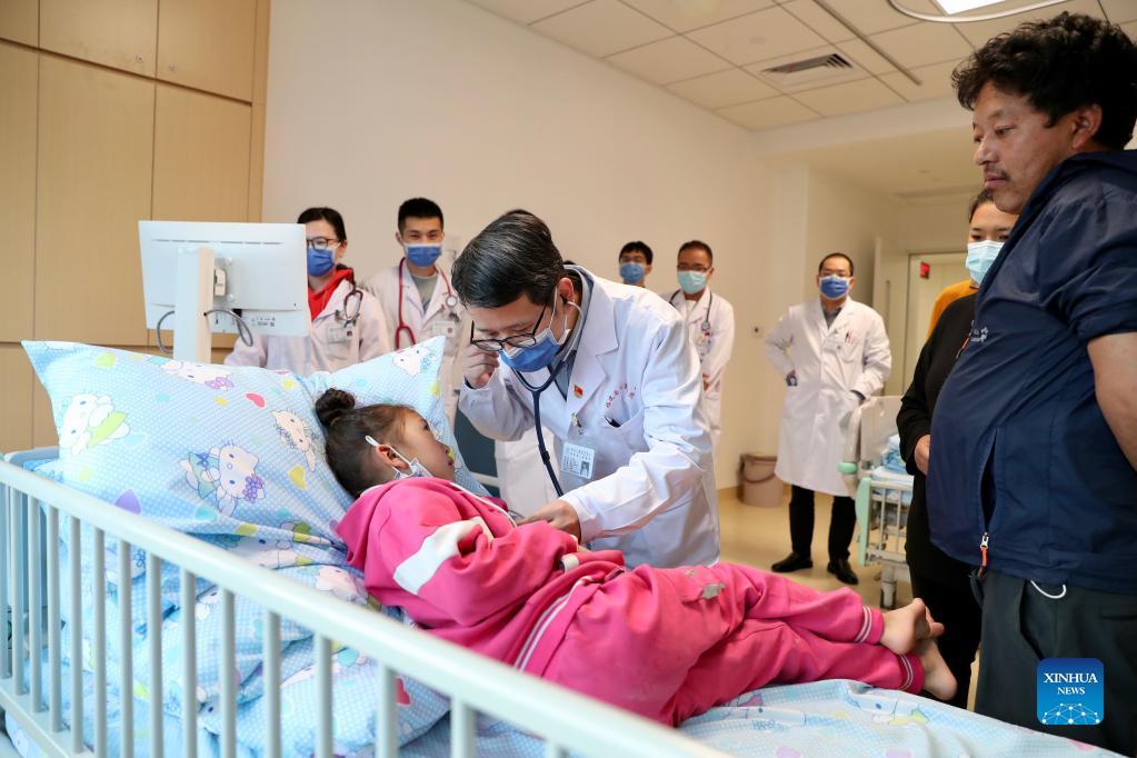 A doctor checks the recovery of a child with congenital heart disease(CHD) in Fujian Children's Hospital in Fuzhou, southeast China's Fujian Province, Nov. 25, 2021. Nine children with CHD from Qamdo of southwest China's Tibet Autonomous Region were discharged from Fujian Children's Hospital after 20 days of free treatment on Wednesday. At the end of October, doctors from Fujian and Shanghai carried out a CHD screening program in Qamdo among more than 1,000 children. Nine children with CHD, accompanied by their families, arrived in Fuzhou on Nov. 12 and received surgery on Nov. 19. (Xinhua/Jiang Kehong)