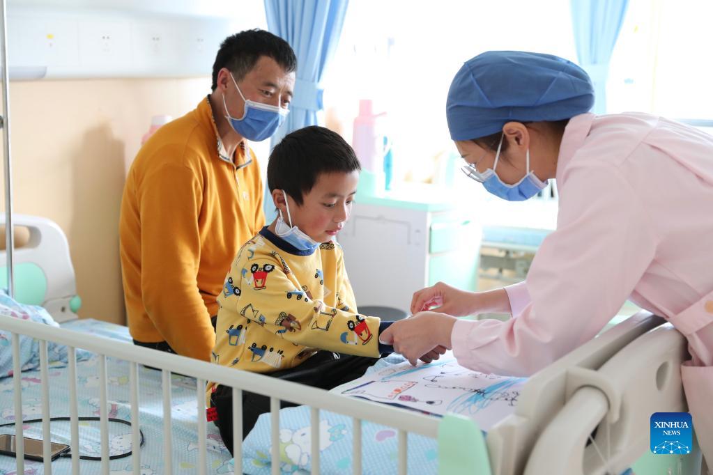 A nurse encourages a child with congenital heart disease (CHD) in Fujian Children's Hospital in Fuzhou, southeast China's Fujian Province, Nov. 25, 2021. Nine children with CHD from Qamdo of southwest China's Tibet Autonomous Region were discharged from Fujian Children's Hospital after 20 days of free treatment on Wednesday. At the end of October, doctors from Fujian and Shanghai carried out a CHD screening program in Qamdo among more than 1,000 children. Nine children with CHD, accompanied by their families, arrived in Fuzhou on Nov. 12 and received surgery on Nov. 19. (Xinhua/Jiang Kehong)