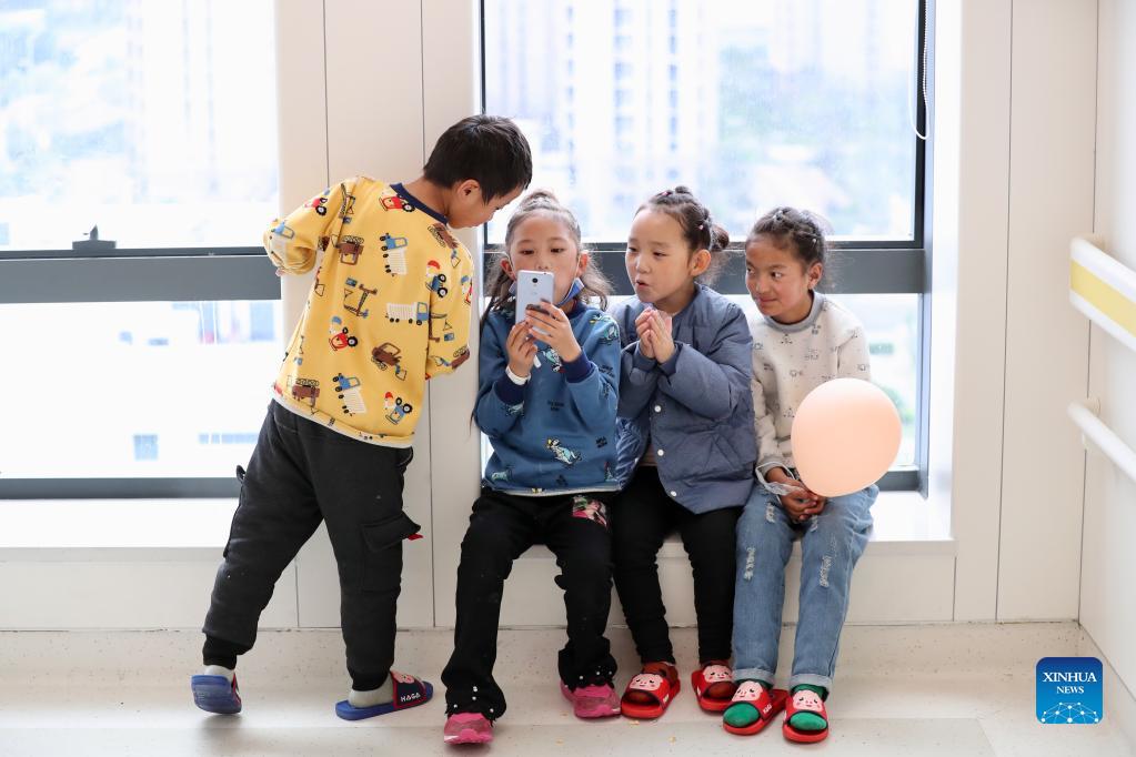 Children with congenital heart disease(CHD) play in the corridor of Fujian Children's Hospital in Fuzhou, southeast China's Fujian Province, Nov. 29, 2021. Nine children with CHD from Qamdo of southwest China's Tibet Autonomous Region were discharged from Fujian Children's Hospital after 20 days of free treatment on Wednesday. At the end of October, doctors from Fujian and Shanghai carried out a CHD screening program in Qamdo among more than 1,000 children. Nine children with CHD, accompanied by their families, arrived in Fuzhou on Nov. 12 and received surgery on Nov. 19. (Xinhua/Jiang Kehong)