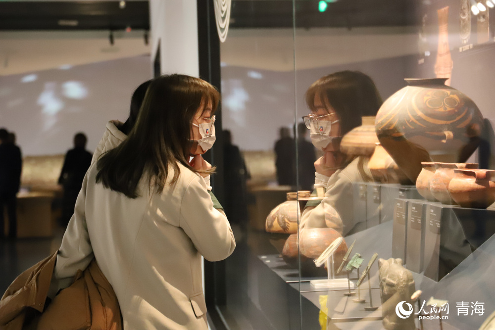 A visitor admires cultural relics on display at the Qinghai Provincial Museum. (People's Daily Online/Yang Qihong)
