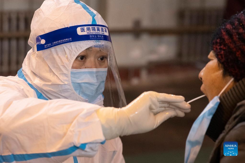 A medical worker takes a swab sample from a resident for nucleic acid testing at a sampling site in Xiangfang District of Harbin City, northeast China's Heilongjiang Province, Dec. 2, 2021. Harbin launched the first round of all-inclusive nucleic acid testing in some areas on Thursday since new locally transmitted confirmed COVID-19 cases were reported. (Xinhua/Zhang Tao)