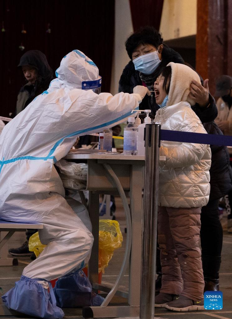 A medical worker takes a swab sample from a child for nucleic acid testing at a sampling site in Xiangfang District of Harbin City, northeast China's Heilongjiang Province, Dec. 2, 2021. Harbin launched the first round of all-inclusive nucleic acid testing in some areas on Thursday since new locally transmitted confirmed COVID-19 cases were reported. (Xinhua/Zhang Tao)