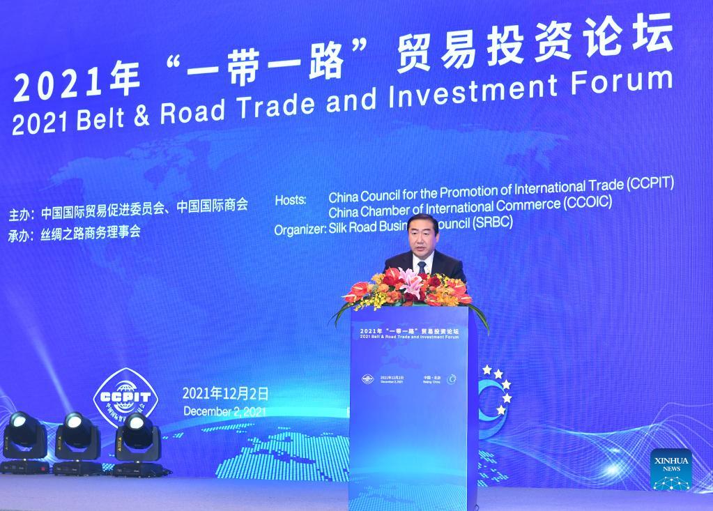 Zhang Shaogang, vice chairman of the China Council for the Promotion of International Trade (CCPIT), addresses the 2021 Belt &Road Trade and Investment Forum in Beijing, capital of China, Dec. 2, 2021. (Xinhua/Li Xin)