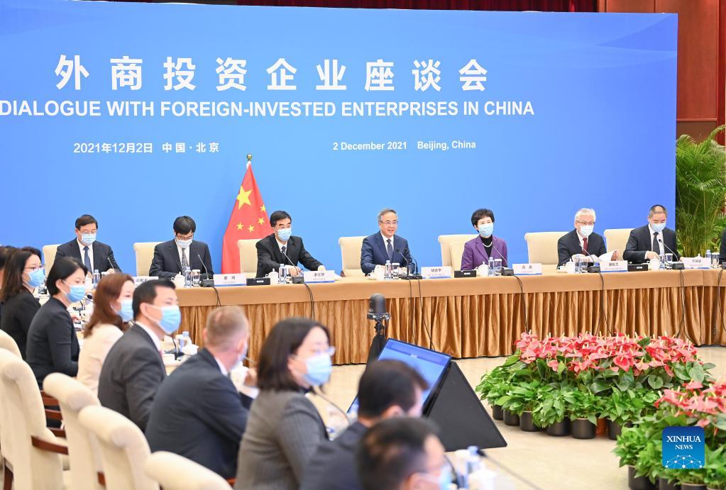 Chinese Vice Premier Hu Chunhua presides over a symposium on the development of foreign-invested enterprises in Beijing, capital of China, Dec. 2, 2021. (Xinhua/Li Xiang)