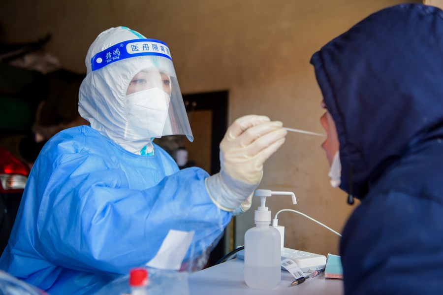 A medical worker takes a swab sample from a resident for nucleic acid testing at a sampling site in Manzhouli, north China's Inner Mongolia Autonomous Region, Dec. 1, 2021. (Xinhua/Li Zhipeng)