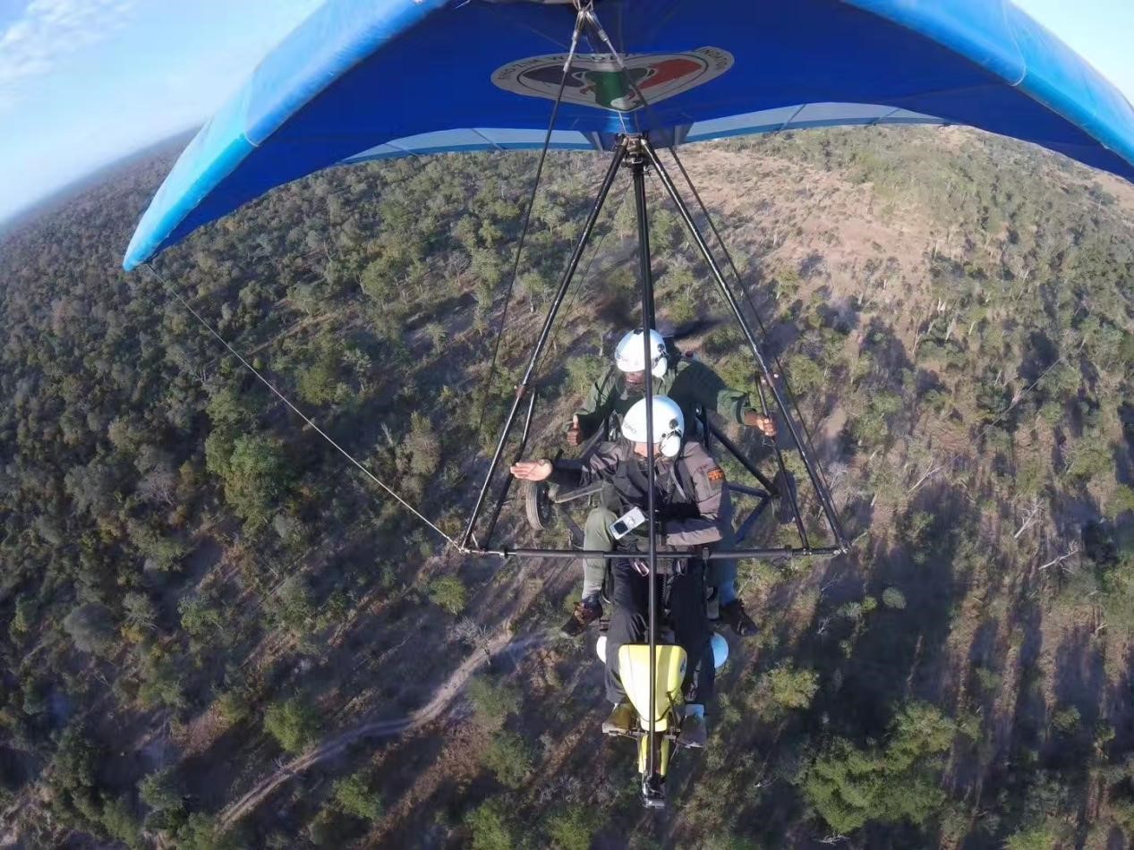 Chinese and Zimbabwean anti-poaching volunteers conduct an aerial patrol on a delta-wing powered hang glider at Mana Pools National Park in Zimbabwe. (Photo/Courtesy of Peaceland Foundation)