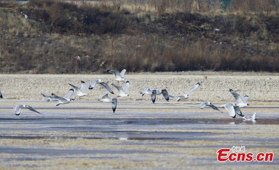 Waterfowls forage at Beichuan River Wetland Park in Xining, northwest China's Qinghai Province, Dec. 2, 2021. (Photo: China News Service/Ma Mingyan)