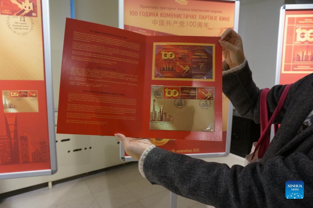 Photo taken on Dec. 1, 2021 shows commemorative stamps dedicated to the 100th anniversary of the founding of the Communist Party of China (CPC) in Belgrade, Serbia. The Post of Serbia held an issuing ceremony on Wednesday for commemorative stamps dedicated to the 100th anniversary of the founding of the CPC. (Xinhua/Shi Zhongyu)