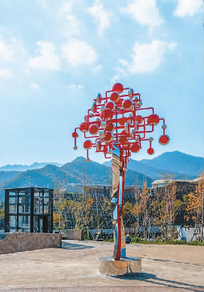 Tu Lala, a teacher with the Chengdu Vocational University of the Arts, based in Chengdu in southwest China, said the curling stones represent the athletes from all around the world who are set to participate in the Winter Olympic Games in Beijing next year. By stringing them all together he wants to express the notion that mankind is a close-knit community. The ski boards have been streamlined to symbolize the National Sliding Center, which is situated not far away by design.