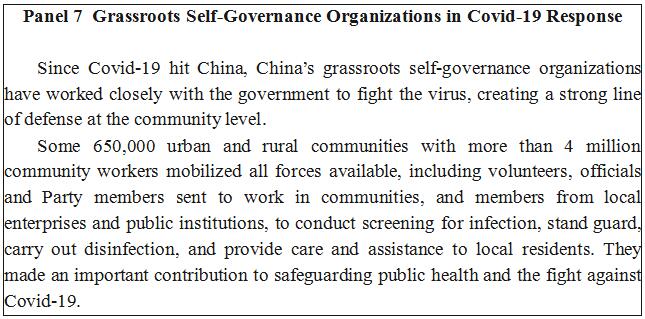 Due to China's huge population and vast territory, there is great diversity in community-level governance. China applies a system of community-level self-governance represented by villagers autonomy, urban residents autonomy, and employees congresses. Under the leadership and support of community-level Party organizations, local residents directly exercise the democratic right to manage their own affairs by serving the community, undertaking self-education, and exercising public scrutiny. This effectively ensures that the people's rights are genuinely respected.