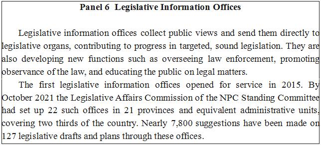 When a piece of legislation is proposed, seminars, hearings and discussions are held to widely solicit public opinion, so that the people's will is reflected from the very first stage of legislation. When a law is being drafted, professionals and the public are both consulted, and now third parties are entrusted to draft laws and regulations on a trial basis. When a draft law is released, it is subject to public review from online channels and news media. Through local legislative information offices, people can participate in the drafting, research, revision, evaluation, and post-assessment of draft laws.