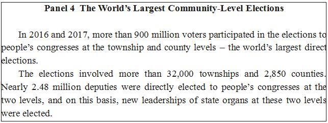 It is of vital importance for China to choose a path to democracy suited to a vast country with a large population. China draws on each and every political achievement of other countries, but does not imitate any of their models of democracy. China welcomes all constructive suggestions and well-intentioned criticism, but rejects any form of overbearing lecture. China must devise the most suitable form of democracy in accordance with its characteristics and realities – a basic principle China adheres to for developing democracy.