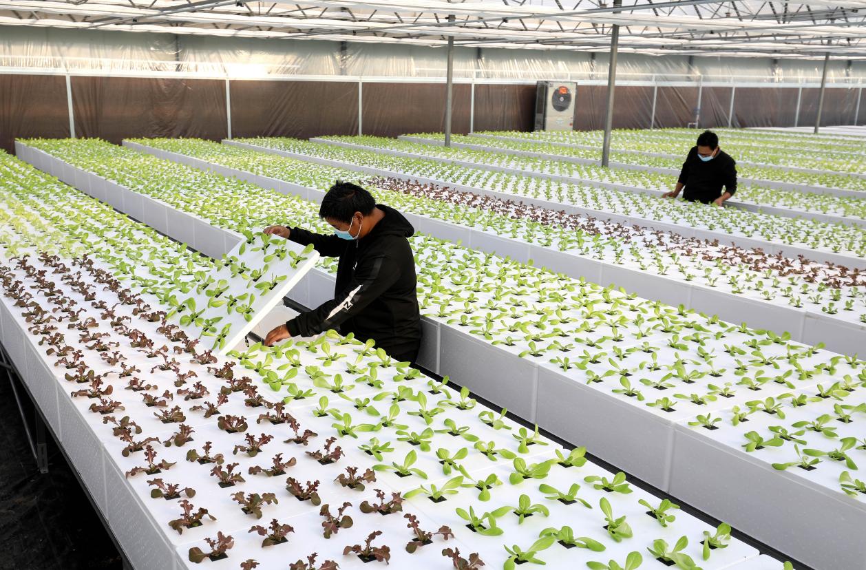 Staff members of a high-tech agricultural park in Gaocheng district, Shijiazhuang city, north China’s Hebei province, check the condition of vegetables growing in aeroponic system, Nov. 27, 2021. (Photo by Liang Zidong/People’s Daily Online)