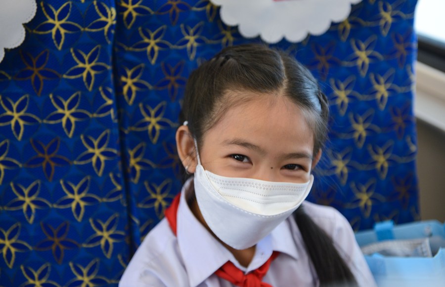 A student from the China-Laos Friendship Nongping Primary School is seen on the Lane Xang EMU train of the China-Laos Railway on Dec. 3, 2021. (Photo by Alan Liu/Xinhua)