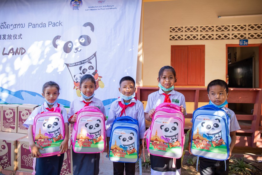 Students receiving Panda Packs from the China Foundation for Poverty Alleviation pose for a group photo at Ban Nongveng Primary School in Vientiane, Laos, Nov. 25, 2020. (Photo by Kaikeo Saiyasane/Xinhua)