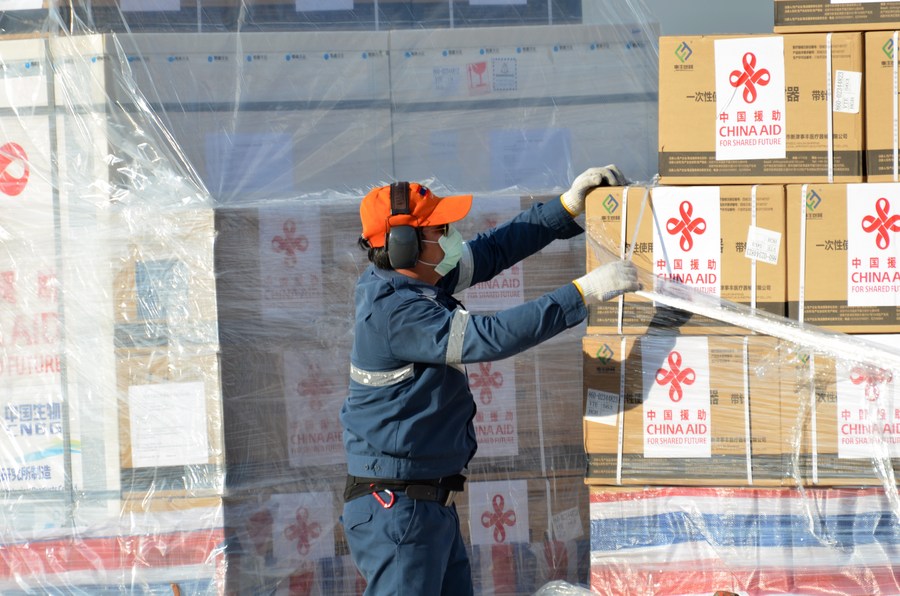 A staff member unloads China-aided medical supplies at Wattay International Airport in Vientiane, Laos, Nov. 17, 2021. (Xinhua/Zhang Jianhua)