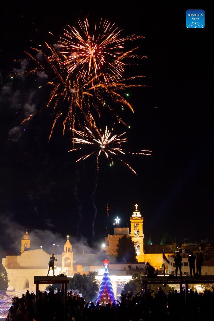 Fireworks explode in the sky during the lighting ceremony of the main Christmas tree at the Manger Square in the West Bank city of Bethlehem, on Dec. 4, 2021. (Photo by Luay Sababa/Xinhua)