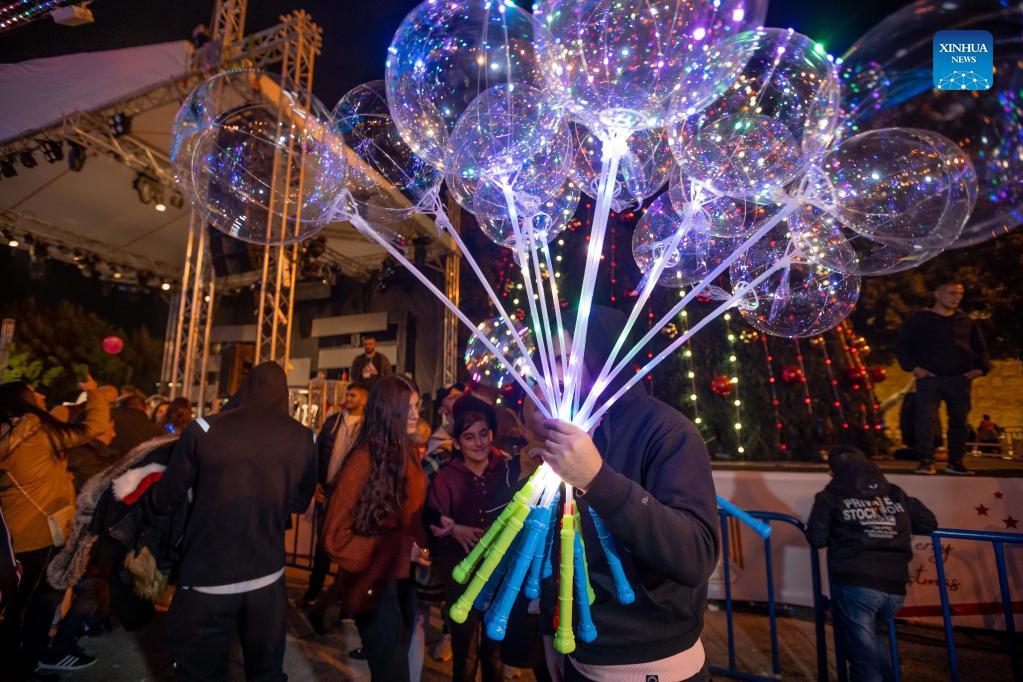 A vendor sells balloons during the lighting ceremony of the main Christmas tree at the Manger Square in the West Bank city of Bethlehem, on Dec. 4, 2021. (Photo by Luay Sababa/Xinhua)