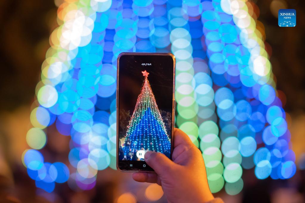 A visitor uses a mobile phone to take photos during the lighting ceremony of the main Christmas tree at the Manger Square in the West Bank city of Bethlehem, on Dec. 4, 2021. (Photo by Luay Sababa/Xinhua)