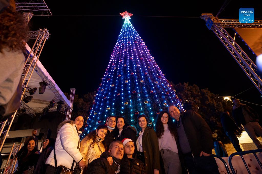 People pose for a photo during the lighting ceremony of the main Christmas tree at the Manger Square in the West Bank city of Bethlehem, on Dec. 4, 2021. (Photo by Luay Sababa/Xinhua)