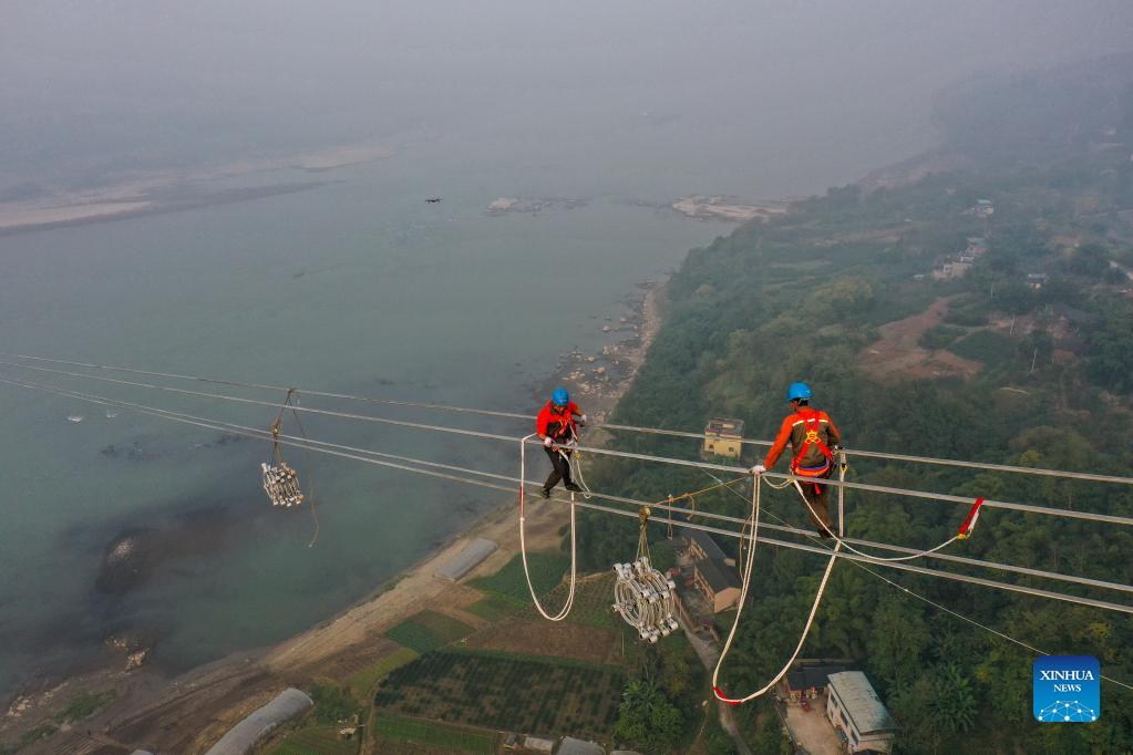 Aerial photo taken on Dec. 5, 2021 shows utility technicians working at the construction site of the Chongqing section of the "Baihetan-Jiangsu" ultra-high-voltage (UHV) power transmission project over the Yangtze River in southwest China's Chongqing Municipality. At a height of about 100 meters over the Yangtze River, a team of utility technicians worked six hours incessantly every day like "spider men", regardless of the winter coldness. The work of the "spider men" is part of the "Baihetan-Jiangsu" ultra-high-voltage (UHV) power transmission project. The 800-kilovolt, direct-current transmission project is celebrated as one of China's "power highways" and is an important part of the country's west-to-east power transmission program. (Xinhua/Liu Chan)