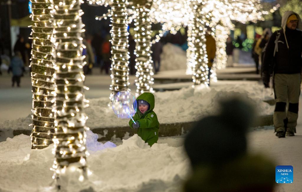 People enjoy Christmas lights in Ogre, Latvia, on Dec. 5, 2021. (Photo by Edijs Palens/Xinhua)
