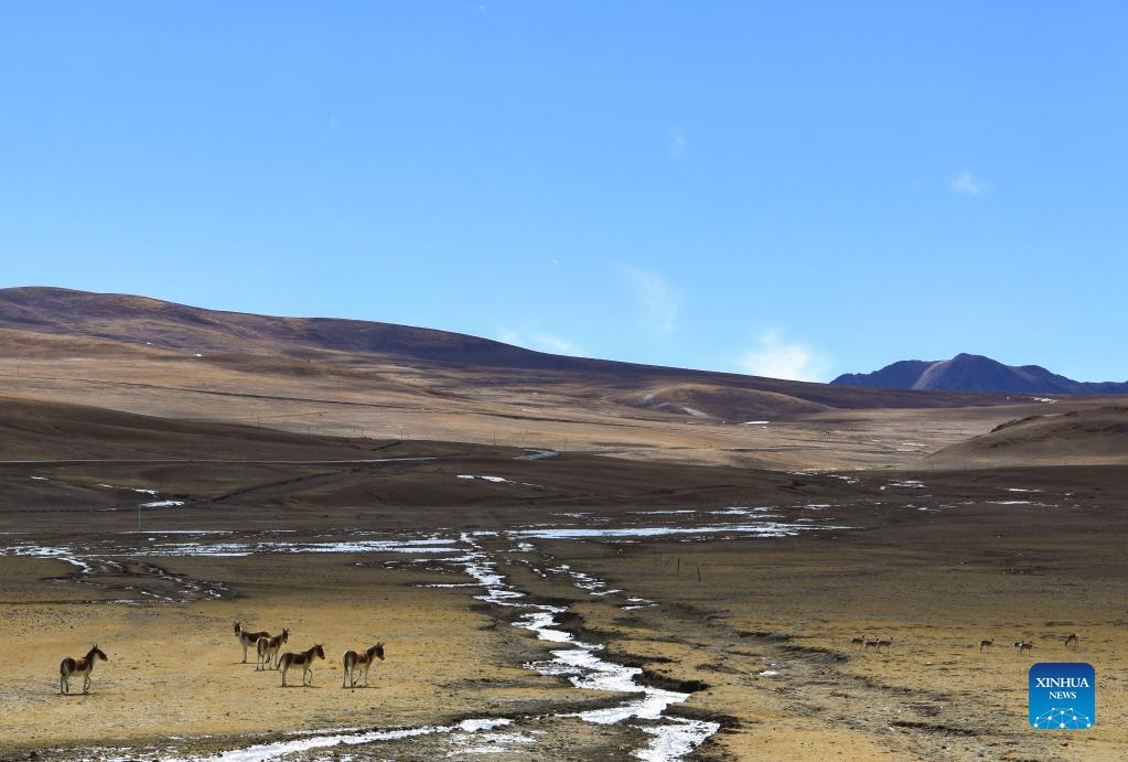 Photo taken on Dec. 4, 2021 shows Kiangs (Equus kiang) at Zhegu grassland in Shannan City, southwest China's Tibet Autonomous Region. (Xinhua/Shen Hongbing)