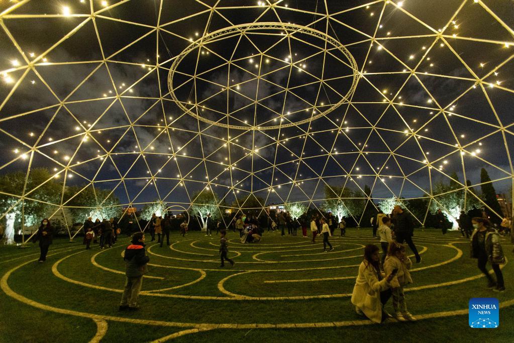 People are seen at Stavros Niarchos Foundation Cultural Center with festive lights in Athens, Greece, on Dec. 5, 2021. (Xinhua/Marios Lolos)