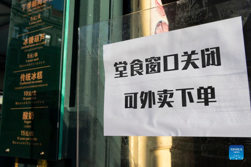 A notice saying a restaurant is temporarily closed is seen on the Central Street in Harbin, northeast China's Heilongjiang Province, Dec. 5, 2021. Harbin announced on Saturday that all restaurants would suspend eat-in service and would only be able to offer pick-up or take-away orders. Besides, all commercial establishments other than those essential to people's daily lives were closed. (Xinhua/Xie Jianfei)