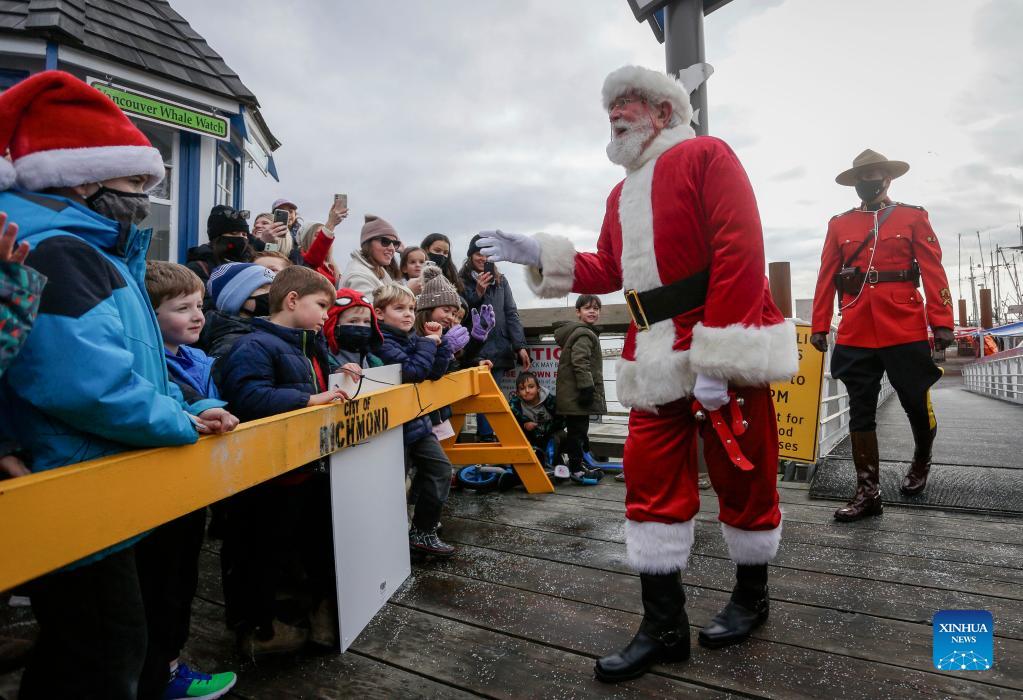 A man dressed as Santa Claus interacts with children at Steveston Village Fisherman's Wharf in Richmond, British Columbia, Canada, on Dec. 5, 2021. The event of Santa Claus' arrival by boat kicked off the holiday season here on Sunday. (Photo by Liang Sen/Xinhua)