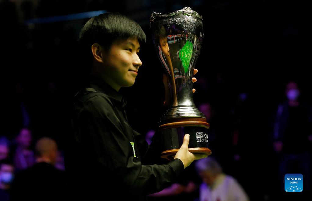 Zhao Xintong of China celebrates with the trophy after winning the final match against Luca Brecel of Belgium at 2021 UK Snooker Championship in York, Britain on Dec. 5, 2021. Zhao beat Brecel 10-5 and claimed the title. (Photo by Craig Brough/Xinhua)