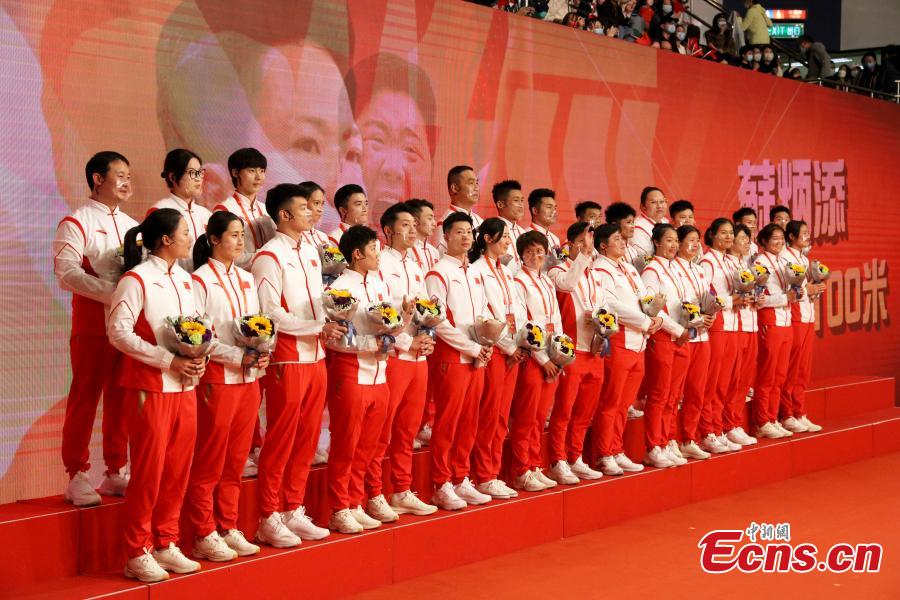 A delegation of Mainland Olympic athletes takes photos during a variety show at the Queen Elizabeth Stadium, Hong Kong, December 4, 2021. (Photo: China News Service/Zhang Yu)