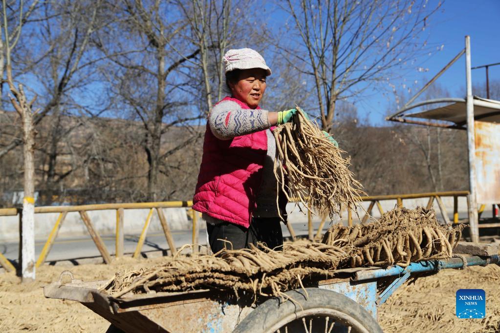 Villagers sort and dry dangshen root from the plant codonopsis pilosula, often used in traditional Chinese medicine (TCM), in Zhangxian County of Dingxi City, northwest China's Gansu Province, on Dec. 5, 2021. In recent years, Zhangxian County has adjusted its farming structure and focused on developing raw materials for the medicine industry. (Xinhua/Wang Kexian)