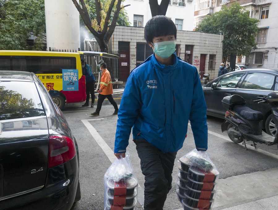 A deliveryman delivers takeaways to the dining hall of a hospital in Wuhan, central China's Hubei Province, Jan. 31, 2020. (Xinhua/Cai Yang)