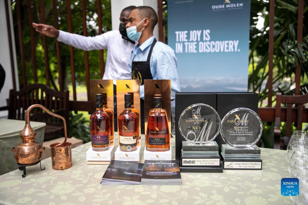 South African brandies are displayed during the awarding ceremony of a brandy competition, namely Brandy Innovation Challenge, in Cape Town, South Africa, on Dec. 6, 2021. The top agricultural official of South Africa's Western Cape Province, the main producing area of South African brandy, said the province is looking forward to new markets in China for its "world-class" brandy. (Xinhua/Lyu Tianran)